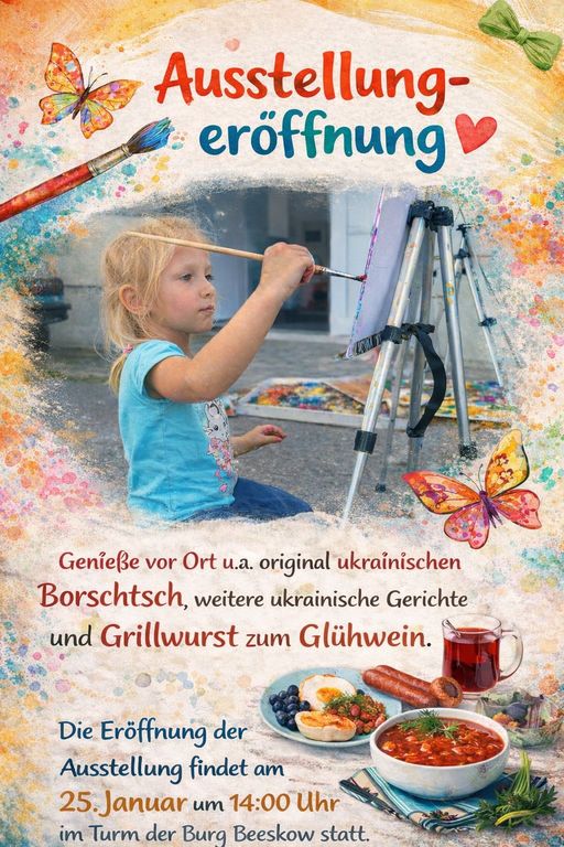 Am Sonntag, den 25. Januar 2026 wurde im Turm der Burg Beeskow die Ausstellung mit Werken von Kindern aus der Ukraine, aus Deutschland und aus anderen Ländern statt, die im Laufe des Jahres 2025 am Kunstprojekt „Identität, Heimat und Orientierung" teilgenommen haben, eröffnet. Das Projekt unter Leitung des Beeskower Künstlers Rostyslav Voronko wird mit Unterstützung des Integrationsbudgets des Landkreises Oder-Spree in Zusammenarbeit mit dem Förderverein Burg Beeskow e.V. durchgeführt und gibt den Kindern auf der Burg Beeskow Raum zum gemeinsamen künstlerischen Experimentieren und Gestalten. Im Vordergrund stehen dabei Begegnung, Austausch und gegenseitiges Verstehen.