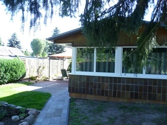 Modernes komplett saniertes Ferienhaus auf Gartengrundstück, Waldnähe, ruhige Lage, Alleinnutzung, große Terrasse, Liegewiese, Gartenmöbel, Grill, Gästecarport auf dem Grundstück, Kamin im Haus, guter Ausgangspunkt für Rad- und Wandertouren ins Schlaubetal.